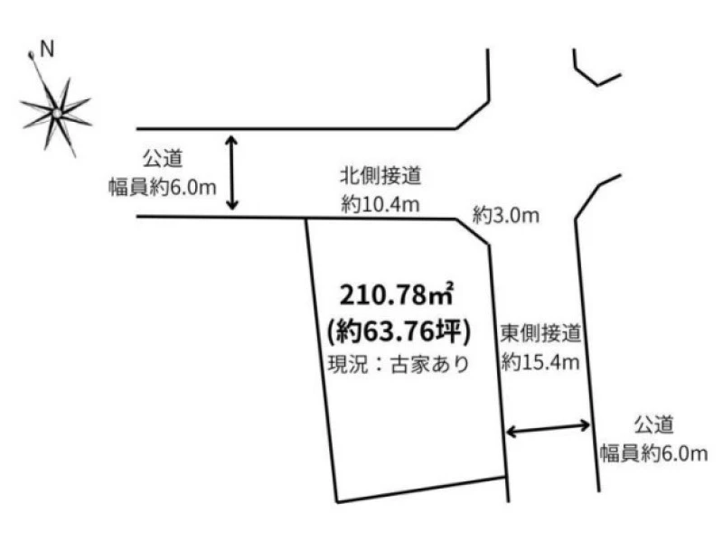角地 北 間口10.4m 公道 幅6m 東 間口15.4m 公道 幅6m |